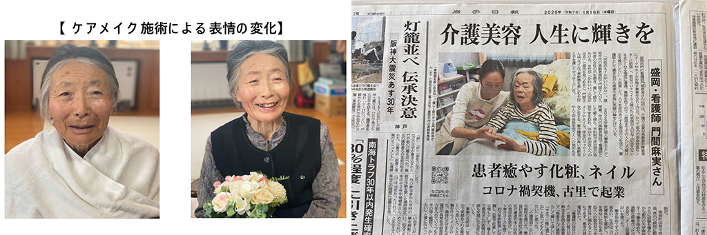 また、岩手日報(2回)やIBC岩手放送(10分番組)など、複数の地元メディアに取り上げられたことで、課題であった「介護美容」の認知度が飛躍的に向上しました。その結果、同業者から20件もの問い合わせが寄せられたほか、